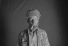 A cross-section of a tree log with black geometric markings, including a square and red and black lines, set against a dark background.